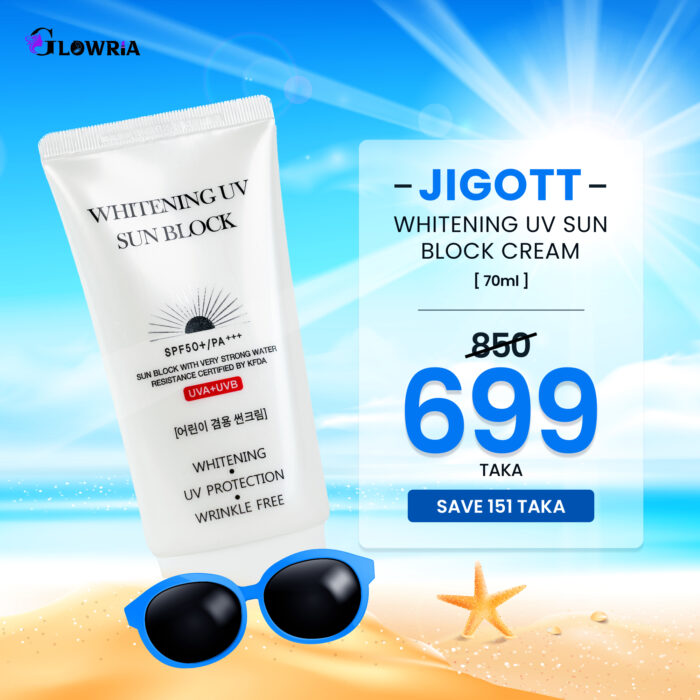 Jigott Whitening UV Sun Block Cream হল একটি কোরিয়ান ব্র্যান্ডের সানস্ক্রিন যা আপনার ত্বককে সূর্যের ক্ষতিকর UVA এবং UVB রশ্মি থেকে রক্ষা করে। এই সানস্ক্রিনটি ত্বকের সাথে খুব সহজে মিশে যায় এবং কোনো ধরনের সাদা দাগ রাখে না।
